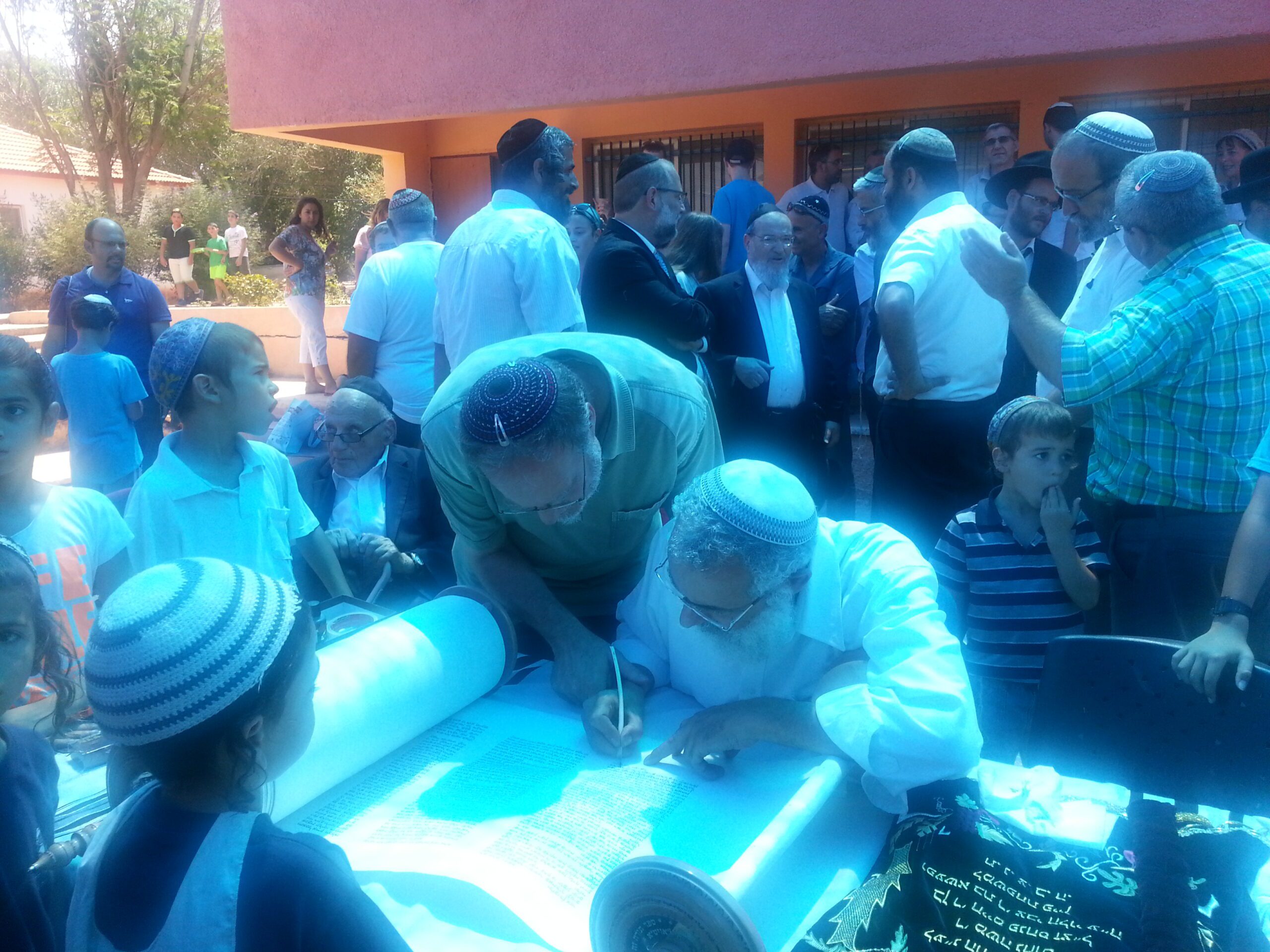 This past Friday I participated in a moving ceremony in the Jordan Valley that I would like to share with you. Very dear friends of mine decided to commission the writing of a Torah Scroll in order to donate it to a community in need. A Torah Scroll contains the entire text of the Five Books of Moses and is written by hand, on parchment, by a specially trained Torah scribe. The technique and rules governing this very precise art date back centuries and, indeed, the Torah scrolls of today look just the same as the Torah scrolls found in the Caves near Qumran, dating more than 2,000 years ago. It is very expensive to commission a scroll and those who do so are considered to have fulfilled a very sacred mission.