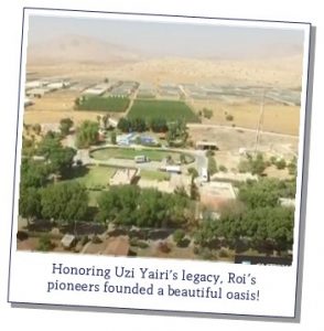 The very next year, in 1976, a group of pioneers sought to honor Uzi’s lifelong legacy of fighting and giving his life for the Land and People of Israel. In his memory, they established a new agricultural community in the Jordan Valley, calling it “Roi,” a partial acronym in Hebrew for Uzi’s full name. Following Uzi’s example, the pioneers of Roi refused to back down from a challenge. Through much toiling and hard work, they turned Roi’s arid landscape into an agricultural oasis of bountiful fields of vineyards, fruit trees and flowers!