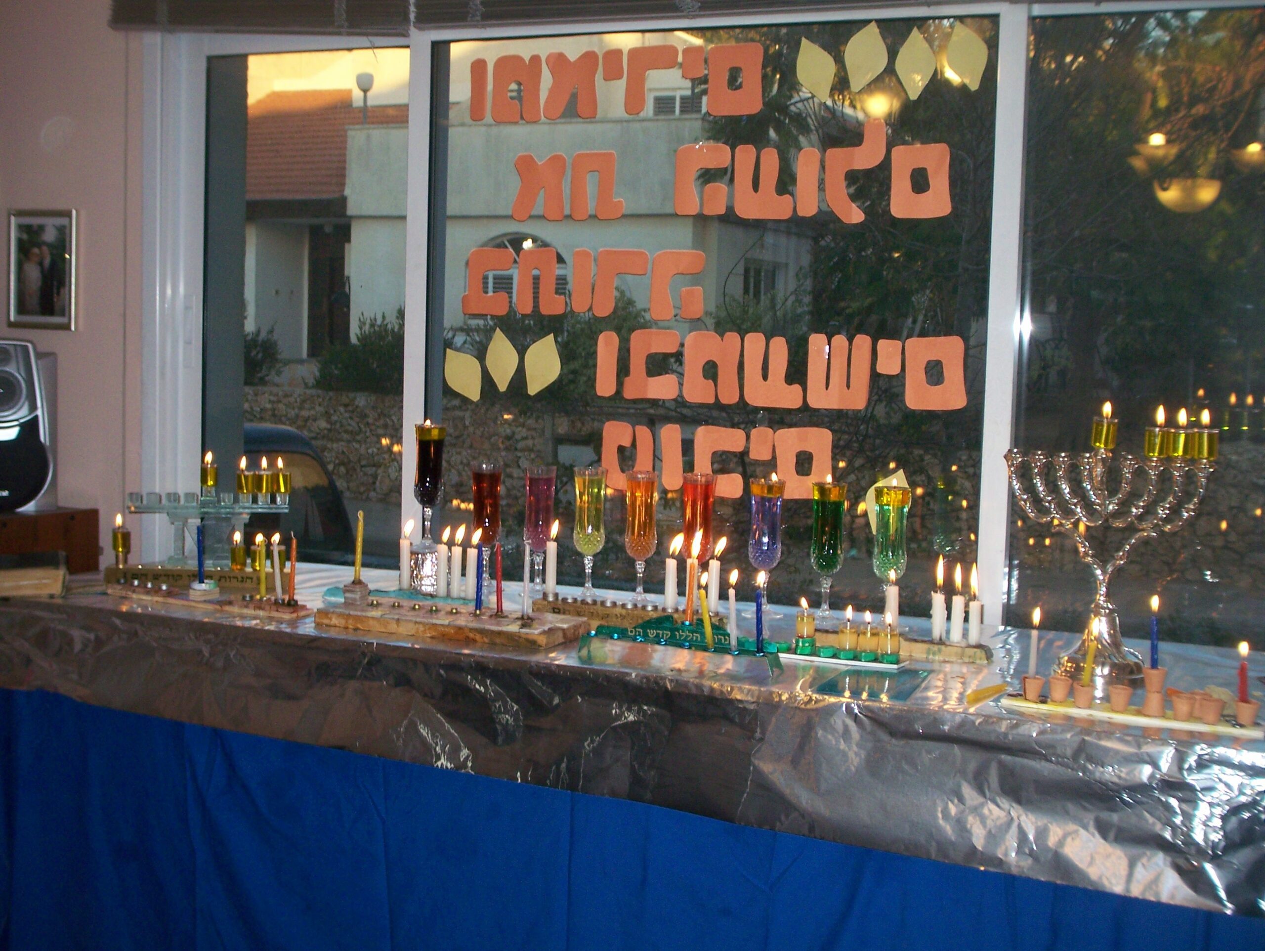 Jewish holidays start at nightfall. On the day before the first lighting ceremony, we reorganize the entire living room. The lighting of the Menorah is supposed to be a public ritual, one that is performed including as many people as possible in each home. We set up the menorahs in the front window, so that all passersby can see our candles. In essence, we are publicizing G-d’s miracle to the Jewish people – we declare to the world that we are a light to the nations and our flame will never die. In our house we drag the couch away from the front bay window, pile up a few bricks from our garden for height, place the piano bench on top, cover the whole contraption with silver foil and a tablecloth to make it look festive, and set up our menorahs. We take turns lighting the candles and reciting the blessings. Everyone takes pride in my grandson Amit’s attempts at pronouncing all the words correctly. The other children all vie for the chance to be the one to guide his little hands as he ecstatically lights his menorah. My grandson, Achiya, is too young, but he is hypnotized by all the dancing flames and the light is reflected in the window and in his big brown eyes.